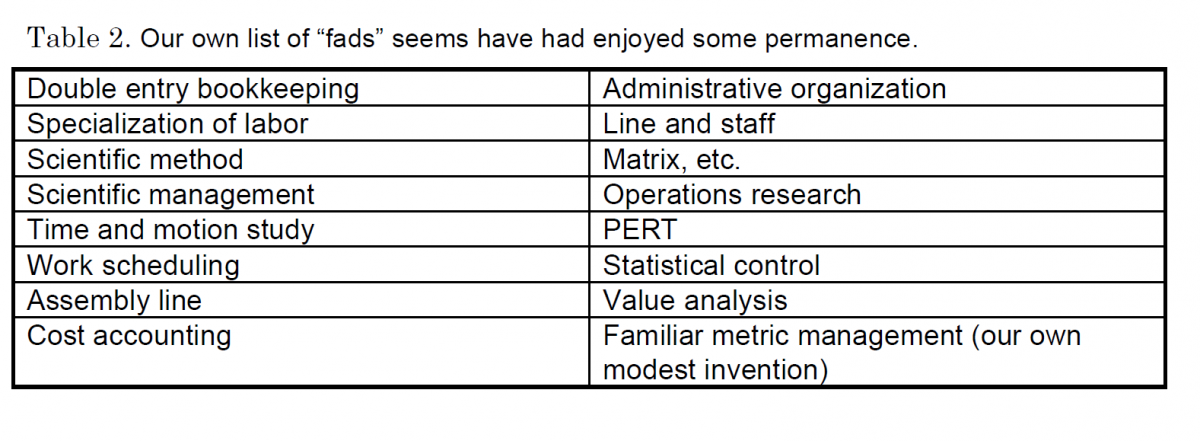 Meantime, Crook’s list of “fads” inspired us to drag out of our memories the list contained in Table 2, starting with double-entry bookkeeping in 14th-century Italy. Perhaps we are biased toward metrics, but it seems to us that metrics does indeed underlie nearly every item on our list.